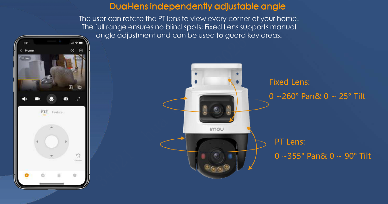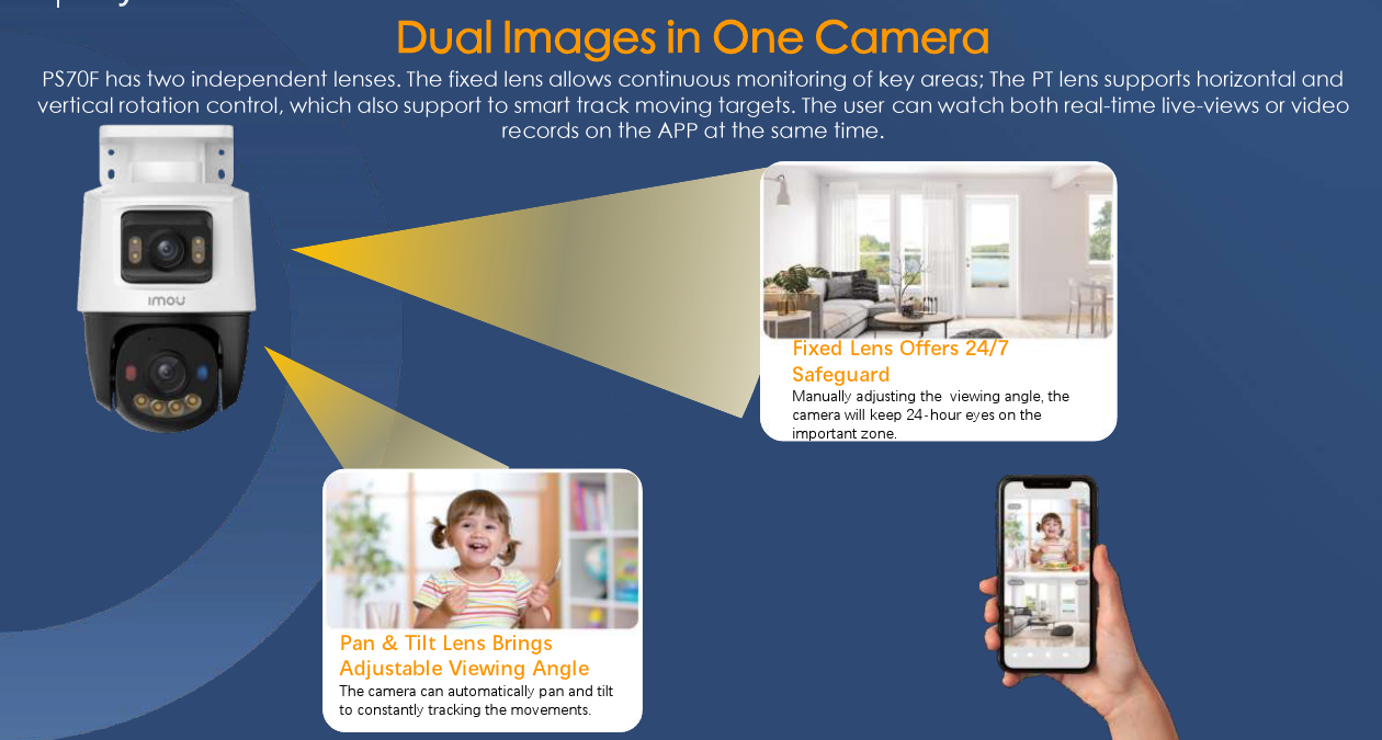 IMOU PS70F PoE là dòng camera an ninh cao cấp trang bị hai ống kính độc lập gồm 1 ống kính cố định và 1 ống kính quay quét. Thiết kế này cho phép giám sát đồng thời hai khu vực hoặc hai góc nhìn khác nhau, giúp một chiếc PS70F có thể thay thế hai camera truyền thống.