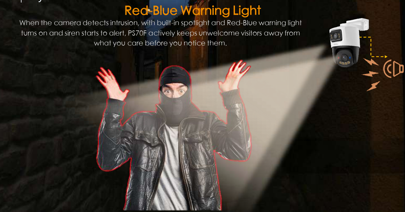 Camera hỗ trợ xoay toàn cảnh 355° – nghiêng 90°, tích hợp đèn cảnh báo đỏ-xanh, đèn chiếu spotlight và còi báo động 110dB, mang đến khả năng răn đe chủ động trước các hành vi xâm nhập. Với công nghệ IMOU SENSE – thuật toán trí tuệ nhân tạo độc quyền, PS70F nhận diện chính xác người và phương tiện, giảm thiểu cảnh báo sai và tối ưu an ninh cho gia đình.