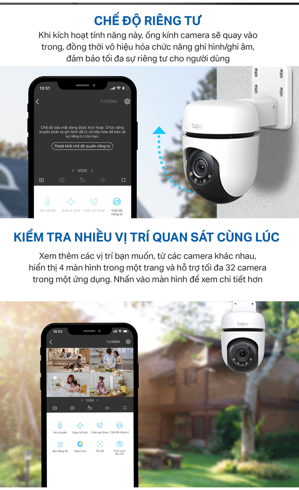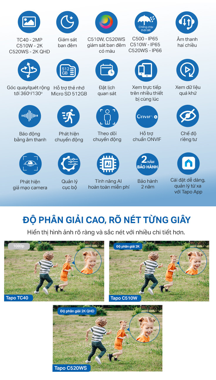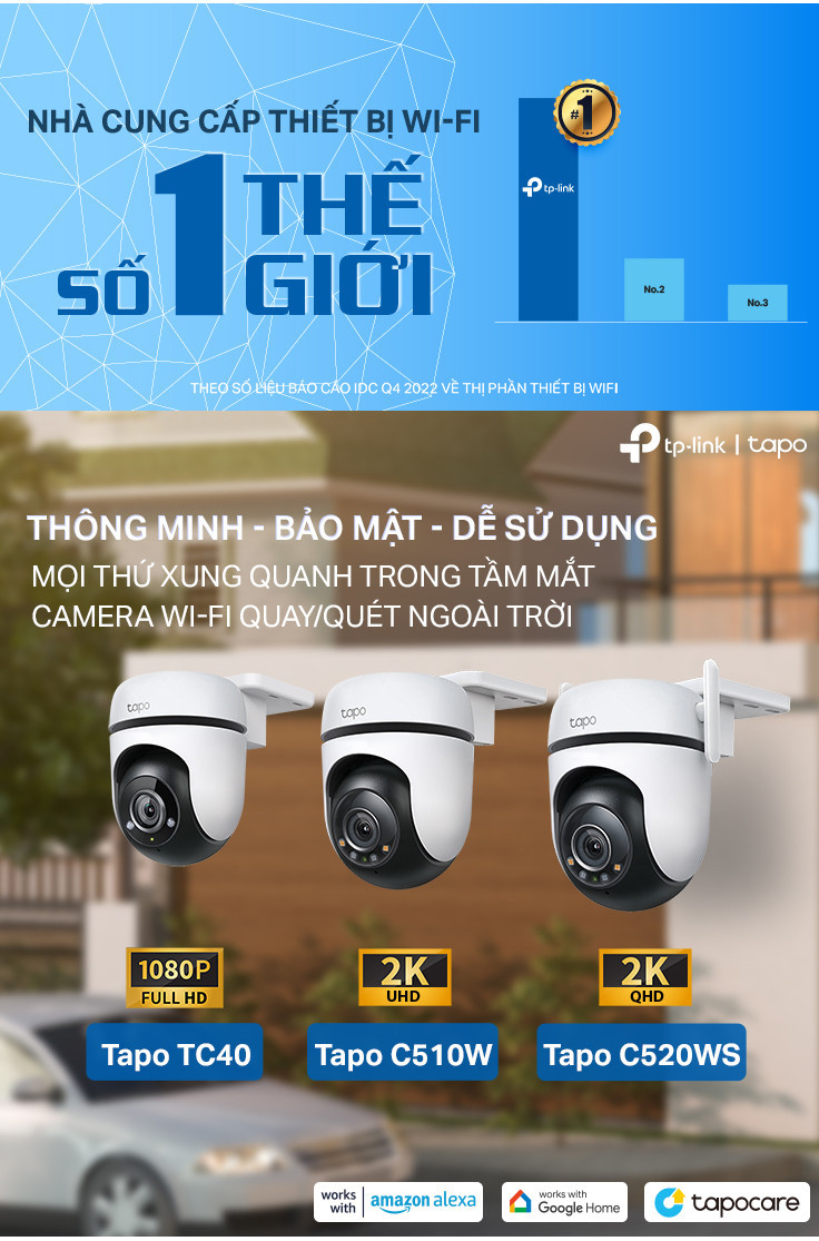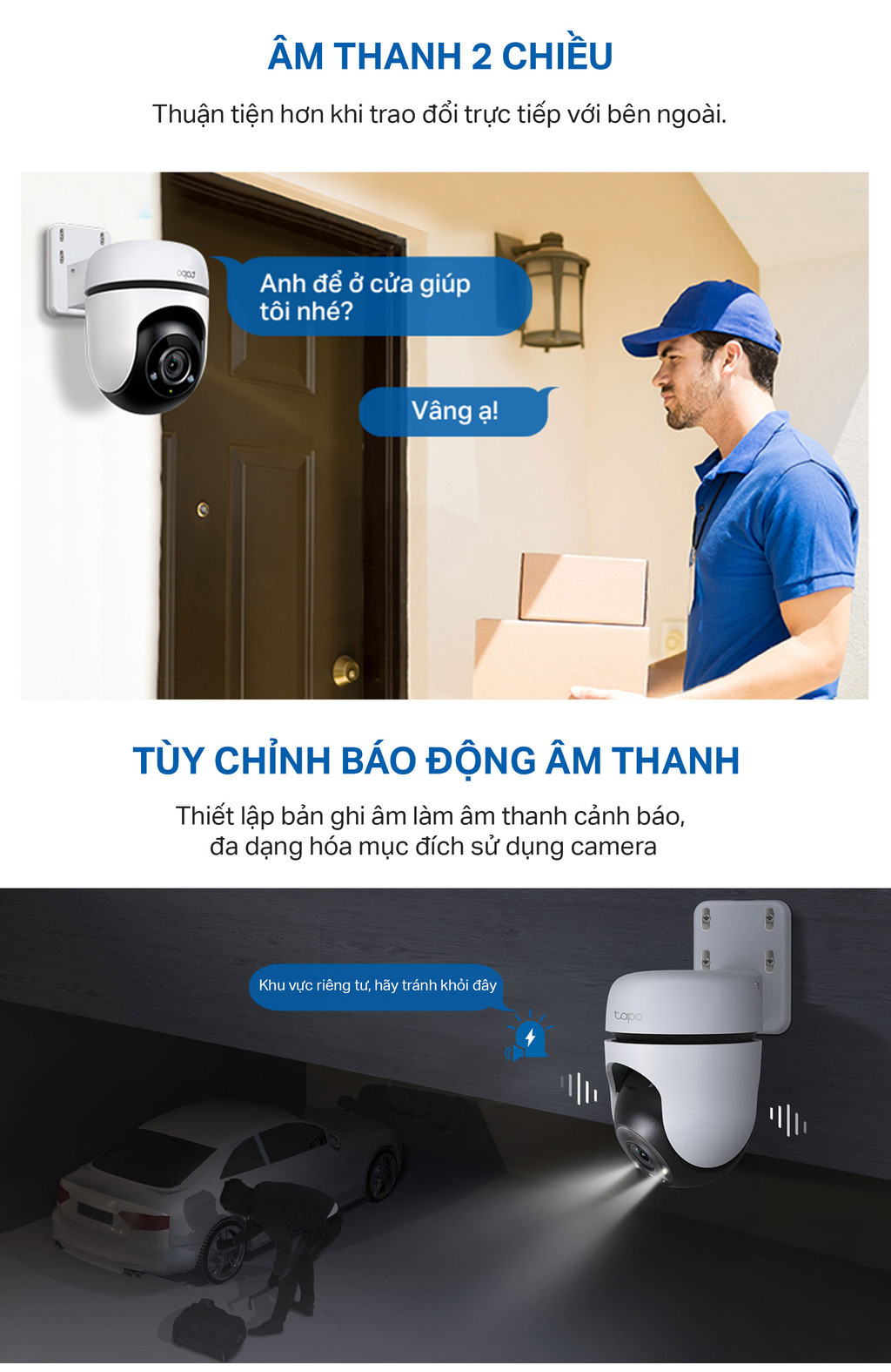 - Độ phân giải 2K - Với độ phân giải 2304 × 1296 px , Tapo C510W tăng cường khả năng bảo mật của bạn bằng cách ghi lại nhiều chi tiết hơn so với 1080p truyền thống (1920 × 1080 px).