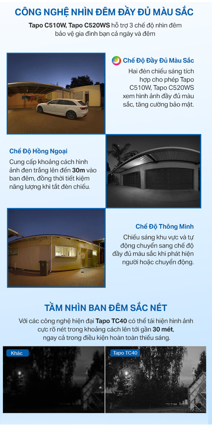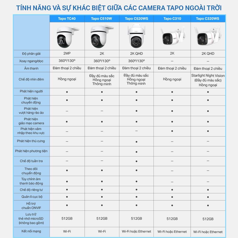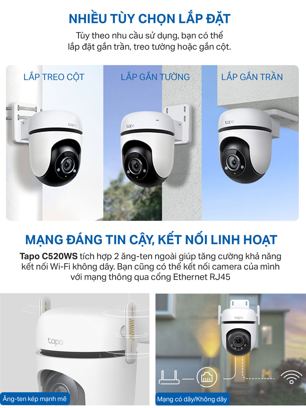 - Độ phân giải 2K - Với độ phân giải 2304 × 1296 px , Tapo C510W tăng cường khả năng bảo mật của bạn bằng cách ghi lại nhiều chi tiết hơn so với 1080p truyền thống (1920 × 1080 px).