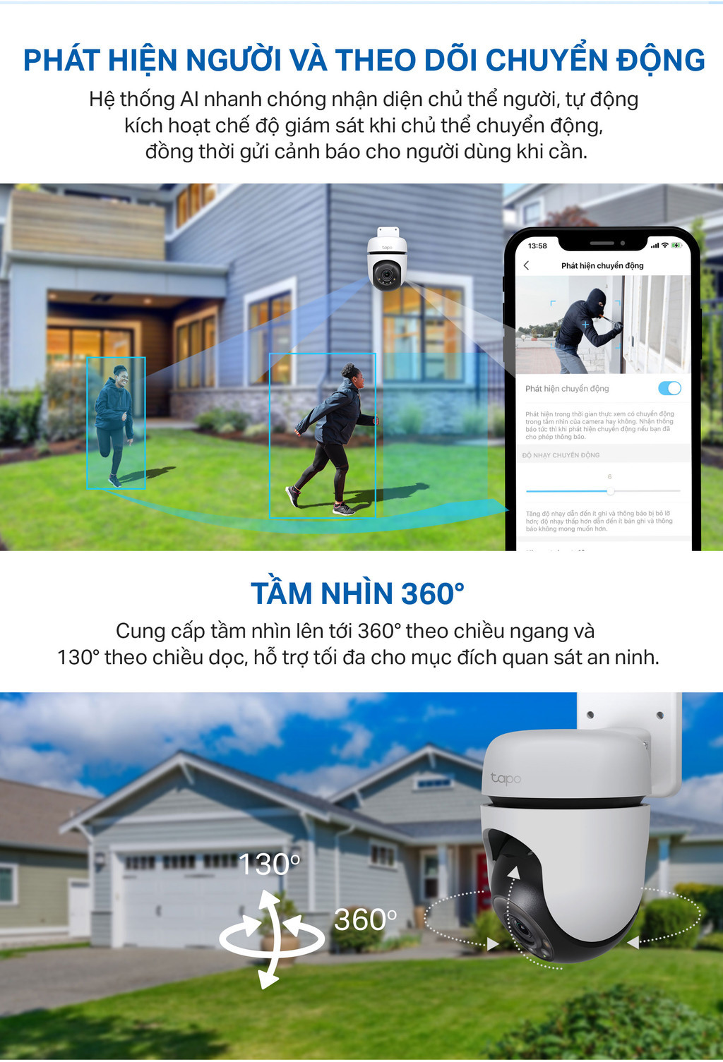 - Theo dõi chuyển động thông minh-Tapo C510W theo dõi chuyển động với tốc độ quay cao, đảm bảo bạn có thể theo dõi các khu vực quan trọng hơn.