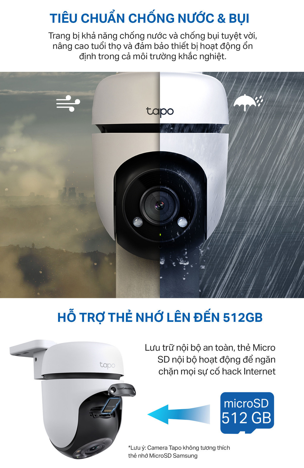 - Bộ nhớ cục bộ và trên đám mây-Lưu các video đã quay vào thẻ nhớ microSD (tối đa 512 GB)† hoặc bằng cách sử dụng dịch vụ đám mây Tapo Care**.